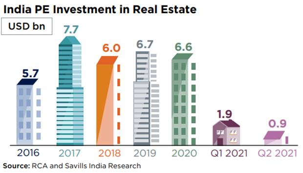 Private equity investment inflows into the Indian real estate sector stood at $2.7 billion (Rs 143 billion) during the first half of 2021, according to the latest report by Savills India.
