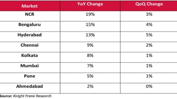 The housing prices in the NCR region continued to see an upward trend in the July-September 2025 quarter, driven by robust demand from end-users and stable economic conditions, according to the latest report by real estate consultancy Knight Frank India. The average price rise in the residential segment year-on-year was recorded at 19% among the top 8 Indian cities.