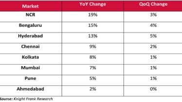 The housing prices in the NCR region continued to see an upward trend in the July-September 2025 quarter, driven by robust demand from end-users and stable economic conditions, according to the latest report by real estate consultancy Knight Frank India. The average price rise in the residential segment year-on-year was recorded at 19% among the top 8 Indian cities.