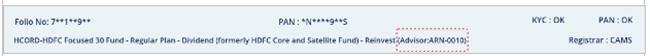 8. In your CAS, there is a field called Advisor as highlighted below. If that field is filled with “ARN” followed by a number code, then it is definitely a Regular Mutual Fund.