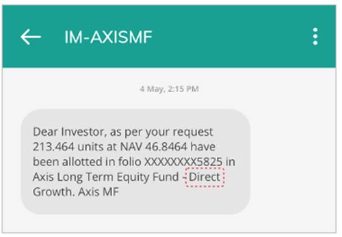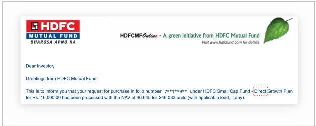 10. One more way you can verify this is from the communication that the AMC sends you via email or SMS. Most of the AMCs mention the variant of the scheme that you invested in. If you cannot find the word “Direct” in either of these communications, then most probably you are investing in a Regular Mutual Fund.
