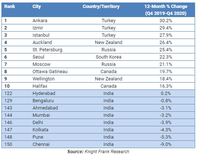 Hyderabad was the only Indian city globally to witness residential price appreciation in Q4 2020, positioning at 122nd rank with a marginal 0.2% year-on-year (YoY) rise in home prices. In terms of the de-growth of residential prices, Chennai was the lowest-ranked Indian city standing at the 150th spot, registering a 9.0% decline in home prices.