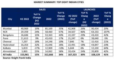 As many as 312,666 residential units were sold across the top eight markets of India in 2022 in the January to December period, registering a growth of 34% year on year (YoY). New home launches also witnessed a significant rise of 41% YoY in 2022 with the addition of 328,129 units in 2022, according to Knight Frank India.