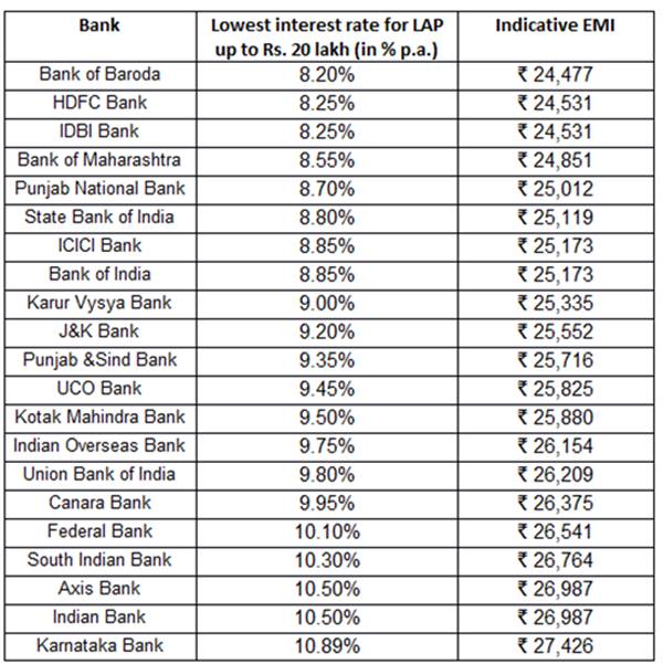So, if you’re looking for a loan against your residential property, here are the lowest advertised interest rates currently being offered by all the major banks in the country for loans up to Rs 20 lakh. We’ve also provided the indicative EMIs for all the offers of the same loan amount for a 10-year tenure.