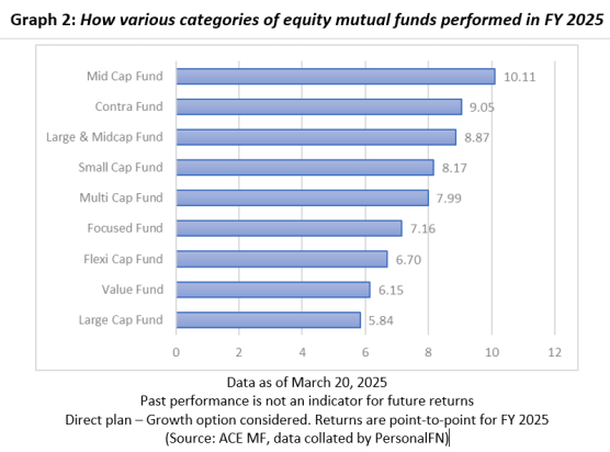 The next in the list are Small Cap Funds and Multi Cap Funds that delivered average returns of about 8%. Despite sharp corrections in the small-cap segment over the last quarter of FY 2025, 19 out of 30 schemes in the Small cap Fund category outperformed their benchmarks. Bandhan Small Cap Fund was the scheme with the highest return in the Small Cap Fund registering a staggering 20% gains while Quant Small Cap Fund underperformed its peers, delivering 0.8% returns.