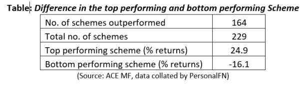 Despite sharp volatility in the market, a vast majority of equity mutual funds across sub-categories not only delivered positive returns but also generated an alpha over their respective benchmark indices. Among the 229 diversified equity mutual fund considered, 164 schemes did better than their benchmarks, an outperformance rate of about 72%. The top performing scheme rewarded investor with a gain of 24.9%, while the bottom performer lost 16.1% in value.
