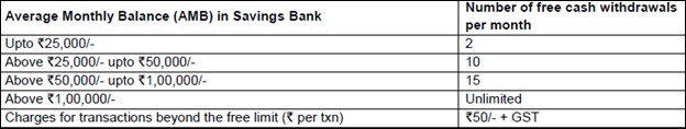 There will be a few free cash withdrawal transactions allowed each month and will be based on the MAB. For example, if the savings bank account holder maintains an Average Monthly Balance (AMB) of up to Rs 25,000, there will be 2 free transactions allowed in a month. Similarly, for AMB between Rs 25,000 and Rs 50,000, there will be 10 free cash withdrawal transactions in a month. Post the free transactions, each transaction will be charged at Rs 50 ( plus GST) irrespective of the AMB. Importantly, the maximum limit for the savings bank account holder to withdraw cash from a non-home branch will be Rs 50,000.