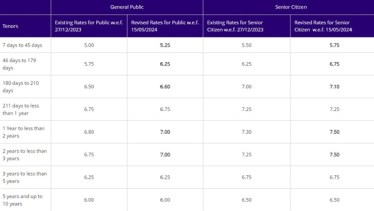 The bank has also revised interest rates for domestic bulk term deposits of Rs 2 crore and above. SBI is offering rates ranging from 5% to 7.5% to its customers on FD periods of up to 10 years. The bank is offering 7% interest rate per annum to general customers subscribing FDs of tenures spanning 1 to 3 years. For same tenure FDs, senior citizens are given up to 7.5% rate.