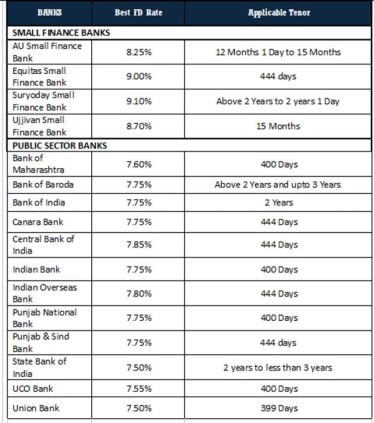 Note: Highest interest rates on term deposits for senior citizens (Deposit amount below Rs 2 Cr) offered by small finance banks and public banks are considered for data compilation. Banks whose websites don’t mention the data are not considered.