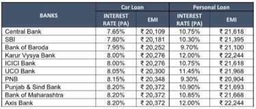 The table below helps you compare car and personal loans along with the interest rates and EMIs on the loan amount of Rs 10 lakh for five years.