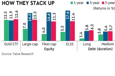 - Gold ETFs have given 12.3% returns in the last one year as compared with 7% in large-cap funds and 5.3% in ELSS