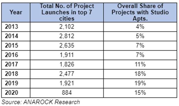 Latest ANAROCK research reveals that out of the total 884 projects launched in 2020 across the top 7 cities, about 130 projects offered studio apartments (a 15% share). In contrast, of the 1,921 projects launched in 2019, around 368 (19%) offered studio apartments.