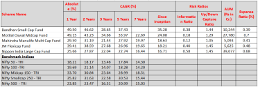 The list of schemes in the table here is not exhaustive. Top return schemes from each key subcategory of equity mutual funds considered.