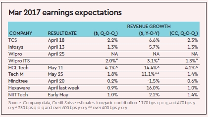 FY18 outlook and guidance will be important: Indian IT companies have been sounding optimistic on the potential cyclical recovery in IT spending, particularly in US BFSI. This same optimism was echoed by Accenture and Cognizant managements. However, this has not translated into any near-term expectation of revenue acceleration. Cognizant has guided for 2017 growth similar to 2016 growth and Accenture’s guidance implies a deceleration from FY16. Company managements’ comments on FY18 could be one near-term trigger for the stocks. We expect Infosys and HCLT to guide to revenue growth of 7-9% and 9-11%.