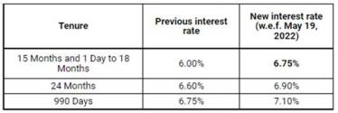 Ujjivan Small Finance Bank, a leading small finance bank, has raised the interest rates on their term deposits with effect from May 19, 2022. It has announced an increase of 75 basis points to 6.75% for a tenure of 15 months 1 day to 18 months, for general public. For 990 days’ tenure, the bank is now offering 7.1%, an increase of 35 basis points.