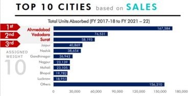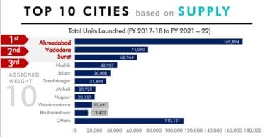 Vadodra – Second ranked Vadodara witnessed a growth of 25% in sales of homes at 17,285 units in fiscal 2021-22 as compared to the previous fiscal. When compared to the financial year 2017-18, a jump of 20% was seen. The supply of new homes stood at 15,046 units in fiscal 2021-22, an increase of 9% as against the previous financial year.