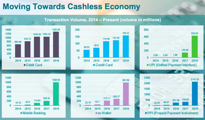 According to the Reserve Bank of India (RBI) and India Macro Advisor (IMA) data, there was 330 per cent rise in UPI payments in 2018 over 2017, about 388 per cent increase in mobile banking, about 244 per cent increase in mobile wallets and over 569 per cent increase in prepaid payment instruments (PPI) over the same period.
