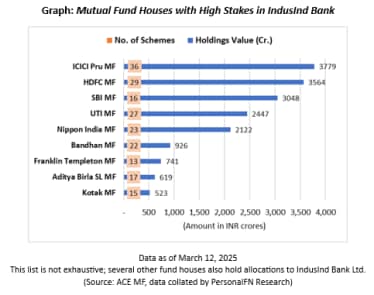 Consequently, fund houses with significant investments in IndusInd Bank are likely to suffer a significant hit. The below graph of reputed fund houses displays their exposure towards IndusInd Bank, including the number of schemes that are invested in the stock.