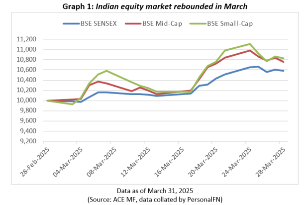 Indian equity markets rebounded in March 2025. The Sensex registered a gain of 5.8%, but underperformed the BSE Midcap and BSE Smallcap index which gained 7.6% and 8.3%, respectively.