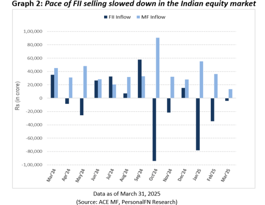 The pace of outflows by foreign investors slowed down substantially, driven by bargain hunting at lower valuations and expectations of economic recovery. In March FIIs net sold equities worth Rs 3,973 crore compared to outflows worth Rs 34,574 crore in February. DIIs continue to be net buyers having bought equities worth Rs 13,458 crore after buying equities worth 36,163 crore in the previous month.