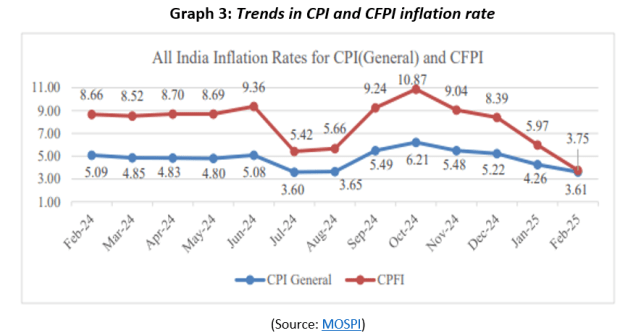 The Consumer Food Price Index (CFPI) also declined sharply to 3.75% in February 2025, compared to 5.97% in January 2025 and 8.66% in February 2024. Vegetable prices softened sequentially as well as y-o-y basis amid seasonal easing of prices.