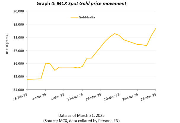 Gold touched new highs in March supported by a weaker US Dollar, tariff fears, and ETF buying. The price per 10 grams of gold stood at a fresh all-time high of Rs 88,691, as of March 31, 2025, rallying by 4.6%.