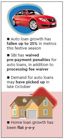 Amid the gloom, State Bank of India (SBI) has waived pre-payment penalties for auto loans, in addition to the waiver on processing fees that it offers every year. Those taking a personal loan from SBI need not pay processing charges either. It has also reduced by 25 basis points (bps) the spread over marginal cost of funds-based lending rate (MCLR) charged for home loans of over Rs 35 lakh.