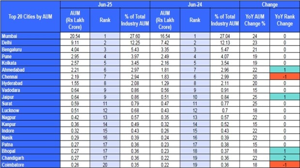 Mumbai and Delhi together account for over 40% of the country’s total mutual fund AUM. Interestingly, cities like Ahmedabad and Jaipur are also seeing rapid growth in investment. Ahmedabad has overtaken Chennai to reach the 6th position.