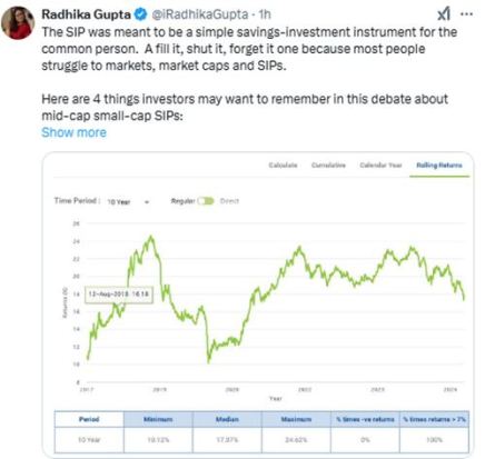 Highlighting this point in one of her social media posts on Monday, Radhika Gupta, MD & CEO of Edelweiss Mutual Fund, said that SIPs were designed as a simple, long-term investment tool, and mid-cap and small-cap investments are beneficial if balanced properly. Stressing that market cycles can make returns look bad in the short term, she emphasized the importance of holding SIPs for at least 10 years.