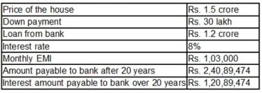 I decide to pay Rs 30 lakh or 20% of the house cost as down payment. The rest amount, i.e. Rs 1.2 crore will be loaned from the bank. Now I need to factor in the interest payable pegged at 8%. Hence, I will now be paying an EMI of Rs 1,03,000. This amount is a 100% increase from what I was paying as a rent.