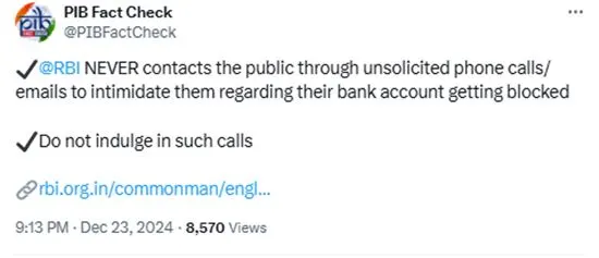 “RBI never contacts the public through unsolicited phone calls/ emails to intimidate them regarding their bank account getting blocked,” informs PIB in its social media post.