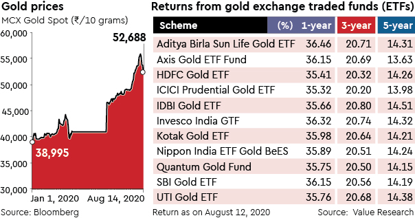 Gold prices, after touching an all-time high of Rs 55,922 per 10 grams on August 7 in the domestic market (MCX spot), slid around 6% to Rs 52,688 on August 14, on the back of profit booking by traders. The NAV of all gold exchange traded funds (ETFs) too declined. The sharp price rise—around 50% in one year—drew a lot of investors to gold ETFs. This year till July, gold ETF category saw net inflow of Rs 4,452 crore. In July, gold ETFs saw net inflows of Rs 921 crore compared to Rs 494 crore in June. The AUM in gold ETF clocked Rs 12,941 crore, as on July 31, 2019, compared to Rs 5,080 crore in the same month last year, a growth of 155%.