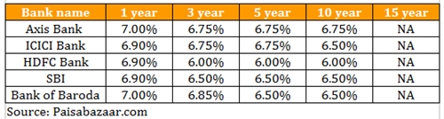 FD rates of commercial bank deposits over 1, 3, 5, 10 and 15 year period (for non-senior citizens)