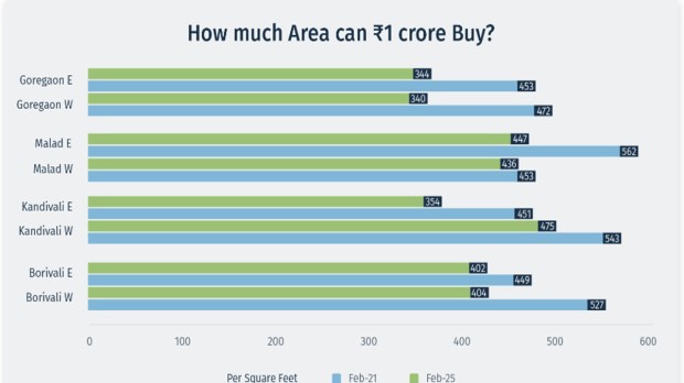 -The chart below contrasts how many square feet a Rs 1 crore corpus could be bought in February 2021 versus February 2025 in different Western Suburbs