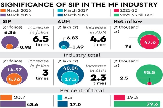 In 2021-22, net fresh inflow via the SIP route, i.e. gross inflows net of redemptions, was 19.3% of fresh inflow in the industry. In 2022-23, till February 2023, net inflow through SIP was almost 80% of the fresh inflows, which is remarkable. The other contributor to this was lump-sum outflows in 2022-23. The equity market, at least the indices, did not do much. Returns from debt funds were muted. This underscores the importance of the discipline imparted by SIP.