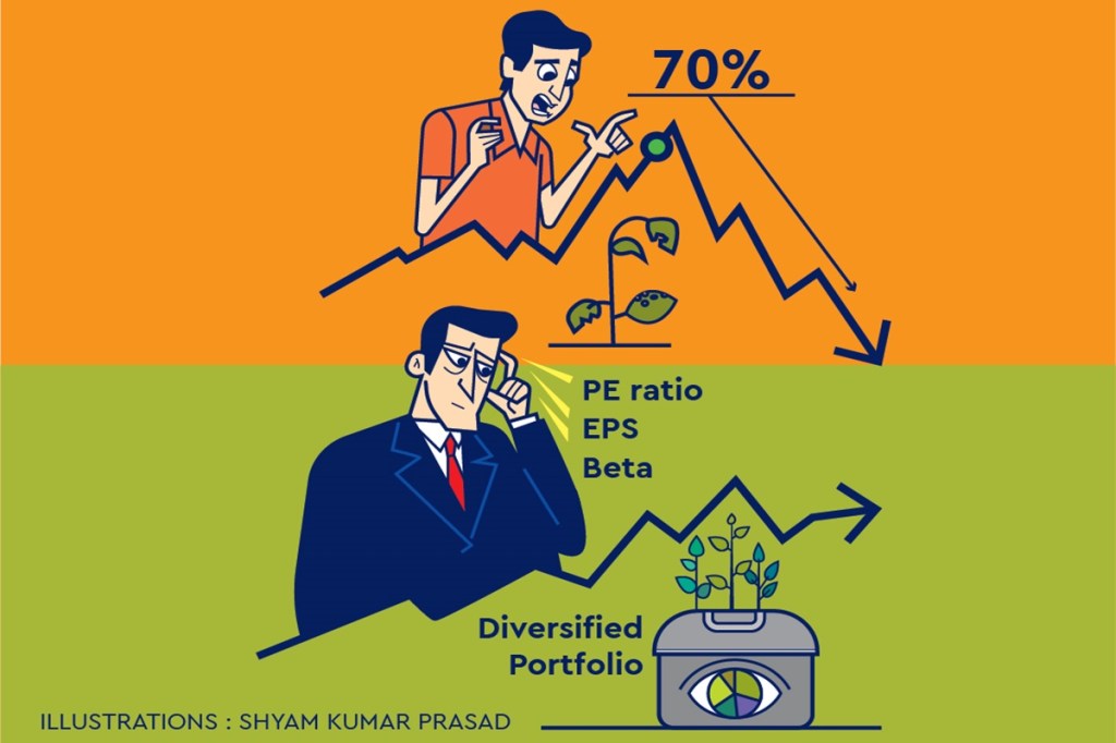 Ramesh, aged 53 years, who had spent his life understanding the market sentiments invested in the stocks where the PE ratio, EPS, long term growth trend, Beta of stock, etc., was favourable and long term sustainability was confirmed. Also, Ramesh invested equitably in a variety of firms with differential returns to average out the returns in totality. During market corrections, Ramesh was able to sustain his portfolio and there was very little impact as he had been diligent in devising a portfolio which was well-diversified so that the loss due to risk was minimised. Also, when the decisions are based on fundamentals, the returns tend to be less volatile.