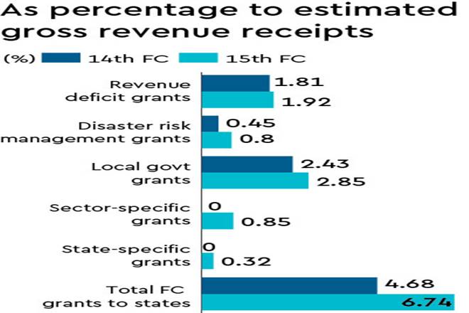 Also, attaching performance criteria to grants may enhance transparency along with accountability, providing necessary feedbacks on improving formulation and implementation of policies, thereby leading to better monitoring of expenditures. The Commission recommended grants aggregating to Rs 10,33,062 crore, which is 6.74% of gross revenue receipts to states.