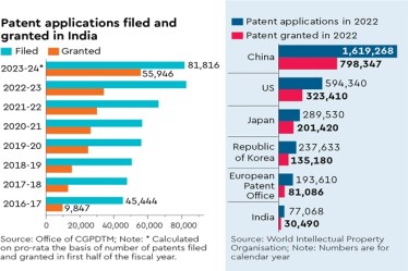 The scale of patenting activity in India was very small until recently. In 2016-17, only 45,444 patent applications were filed and 9,847 were granted. This increased to 82,805 and 34,153 respectively in 2022-23. The provisional data available from Office of Controller General of Patents, Designs and Trademarks (CGPDTM) for the first half of this financial year suggests that we may grant somewhere between 55-60,000 patents this year.