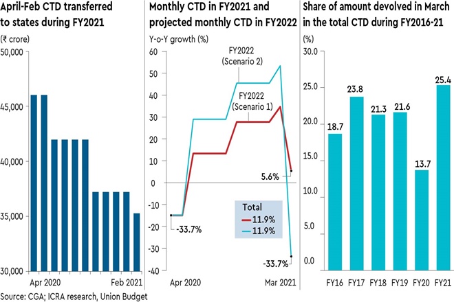 Typically, the amount of devolution by the Centre to the states for the months of April-January of a fiscal, is based on the BE of the former’s gross tax revenues and CTD for that year. At the time of publication of the next fiscal’s Union Budget during Q4, the GoI publishes its revised estimates (RE) for its gross tax revenues, based on the underlying trend of the actual taxes collected during the year. Reflecting the change in the later, the CTD for that fiscal is also modified. Subsequently, the Centre adjusts the amount devolved in February-March, to align the total tax transferred in that fiscal, with the RE for the CTD for that year. At the end of March, if the actual tax collections turn out to be lower than the amount included in the RE (as was the case in FY20), the excess CTD transferred is adjusted from the subsequent year’s devolution. In contrast, if by the end of March, the Centre’s actual tax collections turn out to be higher than the RE (as was the case in FY21), it may devolve the additional CTD in the same fiscal or in the subsequent fiscal.