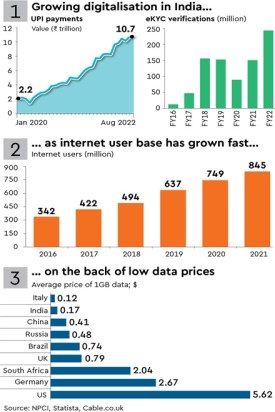 Given the cost of internet data in India is one of the lowest in the world—it has fallen to $0.2 now from $0.7 for 1GB in 2020—the country’s internet user-base has grown phenomenally, driving digital payments. Unified Payments Interface has clocked a record high of 6.6 billion transactions in August, with the total value of Rs 10.7 trillion.
