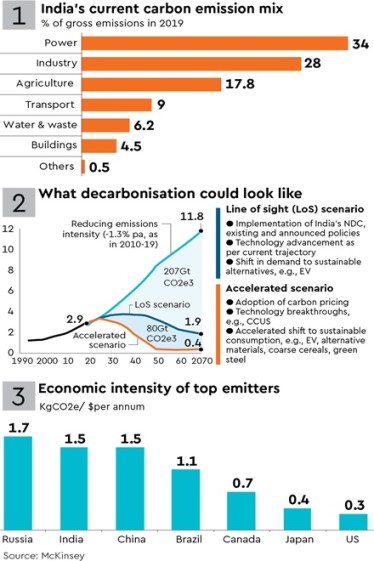 The country has a low per capita emission, but a very high economic intensity of emission. On top, it is the third-largest emitter. McKinsey says that under an accelerated decarbonisation pathway, India could create 287 tonnes of carbon space by 2070.
