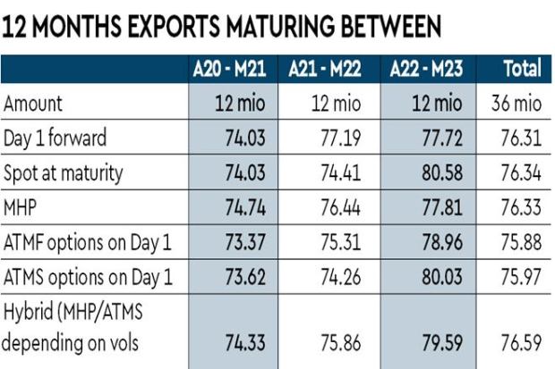 There could be other option strategies that could be used but, as I already said, it is important to recognise that the more exotic the strategy, the worse is likely to be the hit at the bank interface. In general, we believe in keeping things simple, which is why MHP used only forwards; given the structural change both in the forward premiums and option prices, we feel it is the right time to introduce options into the mix.