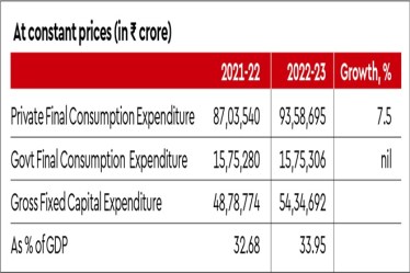 The total consumption expenditure, private and government, grew by just 6.3%. While gross fixed capital expenditure increased by 1.3%, the GDP growth rate for the whole year fell from 9.1% (in 2021-22) to 7.2% (in 2022-23). It is a fact that consumption, rather than capital expenditure, that drives growth in India. Sluggish growth in consumption pointed to less money in the hands of the people or high prices or more pessimism about the future — or all of the above.