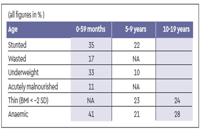 Why malnutrition? Stunting and wasting are signs of chronic/acute undernutrition that reflects failure to receive adequate nutrition over a long period. Wasting may result also from inadequate food intake. The first 1000 days is considered the most important period to intervene to prevent the lifelong damage caused by malnutrition. The highest prevalence of stunting was found in Bihar, Madhya Pradesh, Rajasthan and Uttar Pradesh (37-42 %) and the lowest in Goa and Jammu & Kashmir; higher in rural areas; more likely among children in the poorest wealth quintile; and more likely among scheduled castes/tribes.