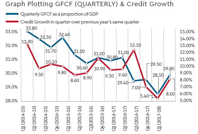 Without burdening this column with numbers, let me draw your attention to the graph (see right). It is for the 13 quarters from April 2014 (the NDA came to power in May 2014) until June 2017 for which data has been published by the CSO/RBI. There are two lines: One line is Investment as measured by Gross Fixed Capital Formation (GFCF) as a proportion of GDP in that quarter. The second line is Credit Growth in that quarter over credit growth in the corresponding quarter of the previous year.