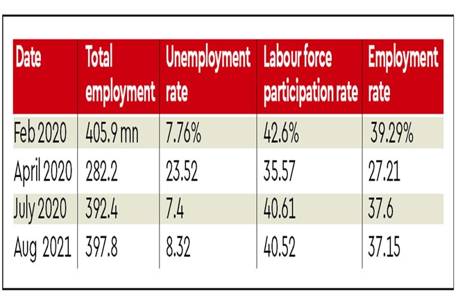 The shrinking of the labour force indicates another serious problem. Both the labour force participation rate (LFPR) and the employment rate in August 2021 are significantly lower than the corresponding rates in February 2020 (see Table). The logical conclusion is that a significant number of people have withdrawn from the labour market (i.e., stopped looking for jobs) and the number of people working (employed) has also fallen. Unless these two ratios are reversed, there is no way to rapidly double the size of the GDP or outclass bigger economies like Germany or Japan.