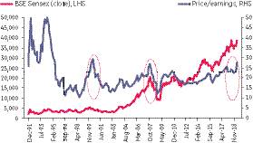 High P/E ratio: The Sensex is quoting at a price-earnings ratio (P/E) of 28.34x. The accompanying chart plots the Sensex (LHS) and the P/E of Sensex companies (RHS, thick plotted series). The P/E ratio at each point has been computed, based on the trailing 12 months’ earnings of Sensex companies. The chart plots the entire journey of the Sensex since the opening of the Indian equity market to foreign investors in June 1992, which was a regime shift for the Indian market.