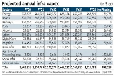 The April 2020 Report of the Task Force on National Infrastructure Pipeline offers the most credible answer. NIP has aggregated information from ministries, departments, states, and the private sector and has sought to capture all projects costing more than Rs 100 crore, whether under conceptualisation or construction (greenfield and brownfield). The accompanying graphic shows the sector-wise availability of investible projects.