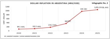 Decades of fiscal deficits, too much currency printing to fund government spending, and loss of public trust in the peso drive dollar inflation in Argentina caused by consistent peso depreciation and hyperinflation. Rising inflation, which reached 211.4% in 2023, eroded the value of the peso, driving people and businesses to use the US dollar as a hedge, therefore lowering consumption of the local currency. Currency controls and a fractured exchange rate system together with a parallel “blue dollar” market only worsen volatility, producing a spiral in which dollar dependence drives peso devaluation. Although monthly inflation has fallen to 2.2% in January 2025 under President Javier Milei’s most recent austerity measures, peso remains unsteady and dollarization trends continue because of sustained underlying economic vulnerability.