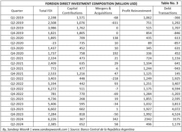 Argentina’s Foreign Direct Investment (FDI) trends from 2019 to mid-2024 reflect volatility shaped by economic instability and external shocks. In 2019, FDI averaged USD 2,628M per quarter, peaking at USD 3,986M (Q3-2019) but marred by debt outflows (-USD 846M in Q4-2019). The 2020 pandemic triggered a collapse, with FDI plunging to -USD 23M (Q2-2020) due to debt withdrawals (-USD 857M). Recovery began in 2021–2023, driven by surging debt transactions (e.g., USD 4,524M in Q4-2023) and profit reinvestment (USD 1,992M in Q4-2023), pushing FDI to record highs (USD 7,284M in Q4-2023). However, 2024 saw a sharp reversal: FDI dropped 62% to USD 2,385M (Q2-2024) as debt inflows fell to USD 1,179M and profit reinvestment halved (USD 496M vs. USD 2,342M in Q1-2024).